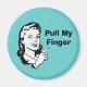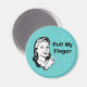 Humourous magnet, with a retro black and white cartoon graphics of a 50's style woman pointing her finger, against a aqua background. Black text reads, Pull My Finger. Great magnet for home or office. Customise the text to read anything you want. Makes a great gift.