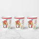 These fun and festive Holiday paper cups feature a big nosed, white bearded, funny little gnome wearing a red and gold Santa Hat embellished with reindeer images. He is getting a bit tangled in the gold ribbon he holds! Two birds perch on him, and another watches from his perch on a green tree bulb. The image is printed twice on the cup, with your custom text in red and green at the centre. A red border with white chain decoration finishes the top portion.