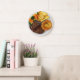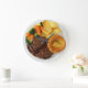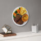 Funny kitchen wall decor clocks with image of a roast beef dinner plate that has carrots, potatoes, and a biscuit on the platter. Designed to add a touch of humour or food theme to your home decor.