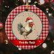 This funny "Peck the Halls" rooster Christmas ornament adds a little farmhouse humour to your holiday decor or Christmas tree. This charming chicken with a Santa hat adds some farmyard whimsy with a touch of holiday poultry fun. A string of lights hangs above the rooster's head, with a partial string of lights hanging from its beak. The rooster is on a pattern of faux tan and white dotted Swiss surrounded by a country style gingham plaid. You can change the humourous text under the rooster, which appears in cream across a ribbon, such as adding your name or year.