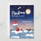 A funny Christmas illustration party invitation featuring a night gradient navy ombre sky, with glowing moons, tars and shooting star and falling snow with a city buildings and light and a blue roof top with stack of snow and Santa claus stuck in the chimney with the red bag of toy, with a modern script font layout. Perfect fun winter holiday party invite.