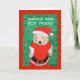 Photograph of an adorable 3 week old golden retriever puppy wearing a Santa Claus suit. This image is used to create cute, funny Merry Christmas greeting cards and note cards. The caption on the front states, "Santa's New Best Friend." Inside the greeting card you are reminded to "throw the dog a bone," in addition to Santa's, the Old Man's cookies. These Merry Christmas cards are appropriate for anyone.