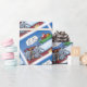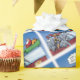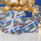 This fun and unique gift wrap features a cartoon illustration of Santa crashing into a house with this sleigh pulled by elephants. (He tried donkeys the year before and they weren't much better). That's why he uses deer now.
