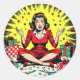 Add a little humor into their holiday season with this cute Christmas sticker with graphics of a funny retro pop art woman sitting in a pile of Christmas gifts, wrapping paper, scissors and bows.