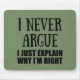 If you like funny sarcastic quotes or great humourous designs then this original slogan " I never argue I just explain why I'm right " is for you. It's a great gift for your family, friends, or yourself! This design is ideal for anyone who loves sarcasm and humour. If you like this funny quote, check out more similar artworks in the Omitay store. Stay safe and thank you for supporting a local artist.