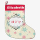 A funny and cute personalised Christms stocking. The background is cream coloured with pink and blue snowflakes. IN the centre is a whiscial hand drawn christmas bauble and inside it says: Fill "er Up. A fun and festive holiday design.