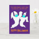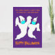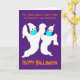 Cartoon showing two cute ghosts wearing face masks with the caption 'For some reason, I don't feel as scary as I did last year!' The card says 'Happy Halloween' on the front and inside says 'Have a great night'. Easily personalise this card by editing any of the template text.