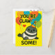 Cute seal postcard featuring adorable cartoon seal with party hat and colourful balloons. Front displays "YOU'RE CLAW-SOME!" pun perfect for sending birthday wishes, vacation greetings, or just because messages. Great for animal lovers and pun enthusiasts to share smiles through the mail. generativecontent.