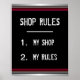 Humorous silver, red and black chalk board look "Shop Rules" poster. Looks great with a black frame!
