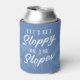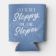 Funny ski bachelorette can coolers featuring a drawing of winter mountains, the humourous saying "let's get sloppy on the slopes", and a text template that is easy to personalise.