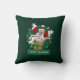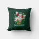 A funny snowman cartoon on a Christmas themed pillow or cushion. Use "Personalize this template" to change the "Merry Christmas!" text and create a unique, customized item; text changes are reflected on both sides. Decorate your house this Christmas with a pillow featuring an excited snowman dressed up as Santa Claus, jumping out of a Christmas present like a jack-in-the-box. The box is wrapped in gold paisley wrapping paper and a green ribbon with white snowflakes.