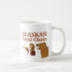 This funny Alaska souvenir mug says Alaskan Food Chain. It has a cartoon mosquito, sockeye salmon, man wearing a lumberjack shirt, and bear, all eating the next one.