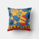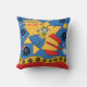 Funny Space Alien pillow, great for kids who love rocket ships and outer space! Features a red, yellow, and blue rocket ship with a green big eyed alien at the controls, stars, and swirls on a blue background with a big yellow star and a blue balloon!