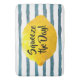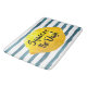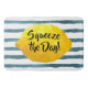Funny quote bath mat featuring a 3D lemon framing the quote "Squeeze the Day" in bold calligraphy script set on a background watercolor pattern of blue horizontal stripes.