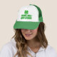 Funny St Patricks Day trucker hats with green lucky shamrock. Vintage style 4 leaf clover vector design for Irish pride party. Distressed look 4 leaf clover image with humourous quote; Drinks well with others. Saint Pattys Day accessories for him or her.