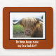Photo of a Scottish Highland steer with adorable long bangs. Sienna brown background with funny text question: "Do these bangs make my face look fat?"