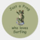 Surfing is an awesome sport that can be enjoyed by people of all ages and this shirt makes surfing look so easy, you'll think anyone can do it. But don't be fooled—you still have to know how to surf in order to look like you know how to surf... Right? Surfing it's not just for human athletes. This funny frog is surfing, and he doesn't look like he's going to stop anytime soon! Get this sticker today and show off your love for frogs and surfing!