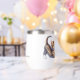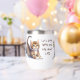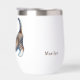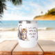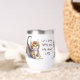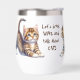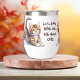 This wine tumbler glass has two images of adorable tabby stripe kittens. The brown text between the images says "Let's drink WINE and talk about CATS". One side also has your name or monogram in matching brown.