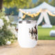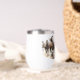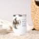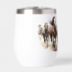 This wine tumbler glass has a pretty watercolor image of running horses. The charcoal grey text beside the image says "Let's drink WINE and talk about HORSES". One side also has your name or monogram in matching grey.
