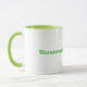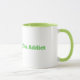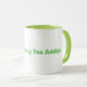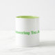 The funny quote, "Unrecovering Tea Addict," on the combo, green and white, 11 oz. mug was inspired by a similar quote we created based on comments made by a good friend who is an attorney.