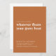 If you love neutrals, this simple style invitation is right for you. The invitation features an elegant design, with a soft, burnt orange background. In the centre, the party details are beautifully scripted in a white text exuding an air of sophistication. The funny text "whatever floats your gravy boat" will give your guests a chuckle before they even show up. Welcome guests to your Thanksgiving dinner party in style. Background colour and text is editable.
