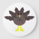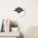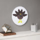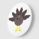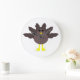 This awesome clock features a funny cartoon of a turkey with big black eyes, a small yellow beak and tail feathers sticking up. The feet are facing in opposite directions making the turkey look clumsy. This amusing design is ideal for Thanksgiving.