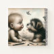 Baby is face to face with a Yorkie puppy. After their eyes meet, they're oddly fascinated with each other. Two birds in the background. Perfect for a new mum's Mother's Day gift or birthday gift.