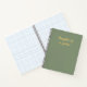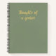 A cute, funny notebook with a modern sage green background on both sides and the script typography in gold reads 'Thoughts of a genius'.