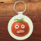 Funny tomato keychain with a cartoon illustration of a weird tomato character with stuck out tongue and a puzzled look in its eyes.
