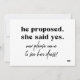 Simple black and white trendy bold typography wedding invitation with a funny "he proposed, she said yes - now please come to see her dress" modern quote script.
