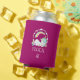 A can cooler cozie with a humourous design. A sleeping uncorn with a fancy mane and tail. Deocrated with a trio of stars stars. A rainbow arches overhead. A circle made up of clouds, hearts and flowers for additional girly flair. Typography says Magical AF. Humourous and cute. The background is a dark pink cerise colour.