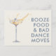 Make your announcement unforgettable with these funny unique wedding save the date postcards! Featuring a playful champagne glass design with a sparkling ring inside, the front boldly declares, ‘Booze, food, and bad dance moves’—perfect for couples who love to celebrate with humour and style.