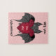 Cute and funny amorous vampire bat in love holding a big red heart that reads "Will you be my Valentine?". Shown here on a fun puzzle gift idea for someone special.