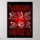 The image is a stylised illustration of a vampire killing kit. The words "Transylvania" and "Survival KIT" are written in large, red, gothic-style font at the top and bottom, respectively. In between, there are six white outlined drawings of items traditionally used to kill vampires: a stake and mallet, a bible, a pistol with silver bullets, a bottle of holy water, garlic, and a cross. Perfect gift for Goths and vampire lovers.