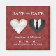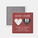 Announce your wedding in an original and informal way with this funny Save the Date announcement keepsake magnet featuring heart shaped bride and groom, wedding couple illustration on red.