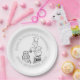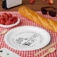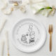 Funny Wedding Day paper plates for a wedding party or outdoor reception. Illustration of a wedding cake being iced, and wording that includes the names of the bride and bridegroom as well as the date of the wedding. Wedding paper plates.