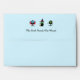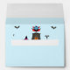 Envelope that matches a separate change of address card. Envelope shows "The Smith Family Has Moved" on the flap below a vampire, witch, and green monster. Customise the text. A haunted house full of Halloween characters, including a vampire, witch, ghost, devil, mummy, grim reaper, monster, and pumpkins displays inside the envelope. The background is light blue.