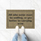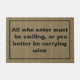 Graphic door mat done in a grass mat look, with a black line border, around the edge. Bold black text reading All who enter must be smiling, or you better be carrying wine is fully custom and can be personalised to read what you want.