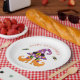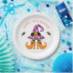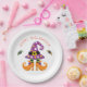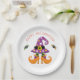 These cute Halloween paper plates feature orange booted witch's feet sticking out from a star spangled purple witch hat. Little black bats with green and gold wings fly at each side. The orange text says "Happy Halloween" in a semi circle. Cute, especially for kids, or for any Halloween celebration. Graphics by Prettygrafik Design, © Prettygrafik.com