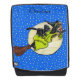 This Bold Face adult backpack with a interchangeable front face has a funny witch wearing a green dress and black hat flying past a full moon on her broom with her black cat riding on her back on a blue night sky background covered in yellow stars. Customise your name with the template.