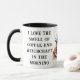 Funny Witch Themed Orange and Black Pumpkin Halloween Mug - Customisable text reads "I Love the Smell of Coffee and Witchcraft in the Morning" with a watercolor illustration of a witchy cup of coffee complete with fall decor, pumpkins, a black witch hat and bats. Perfect for those who love all things Halloween, witchy or just want a fun and funny mug for the fall season.