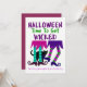Fun Halloween party invites with wicked witch legs in stripe stockings and a black cat peeping through the dancing legs. Such funny text Halloween, Time To Get Wicked, Park Your Broomstick And Join In The Fun and so easy to customise with your personal party details at no extra charge.
