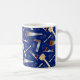 Funny mug for DIY enthusiasts, carpenters and handymen. Dark blue with carpentry tools patterned over it.