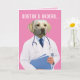 A very serious-looking yellow lab wearing a lab coat (he's a "dogtor"). The front says, "Dogtor's orders..." Inside the card has a list of orders to follow (which are very similar to dog commands): "LIE DOWN, PIG OUT, WATCH TV, ROLL OVER, REST SLEEP, HEAL. GET WELL!