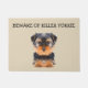 Funny front door welcome mats with image of a cute Yorkie dog and the funny words beware of killer Yorkie. Designed as a humourous front house door mat to greet your guests and visitors with a smile.