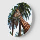 Pictured standing tall beside palm trees a funny Giraffe is poking out her tongue