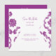 Fushia Damask Envelope Style Square. Photo Wedding Save the Date. Back with Bride and Groom Photo last names as well as the text Wedding. Website. Black and white filter applied to photo.