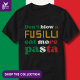 Fun Fusilli Pasta DON'T BLOW A FUSILLI Italian Colours T-Shirt, designed with the word FUSILLI made out of fusilli pasta. The wording is created in the colours of the Italian flag – green, white and red – and reads DON'T BLOW A FUSILLI EAT MORE PASTA. A fun, lighthearted pasta t-shirt to tell everyone how much you love pasta. This would make a great gift for pasta-loving electricians, or to calm down highly excitable friends!