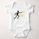 Future fencer black silhouette fencing baby bodysuit that displays a minimalist pictogram icon of a black silhouette of a fencer holding his sword and the text “Future fencer” on white background.