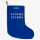 Fun stocking for military kids features "Future Flyboy" in military style stencil text with customisable child's name in modern script. Air Force blue background with grey and white text. Perfect for baby's first Christmas.